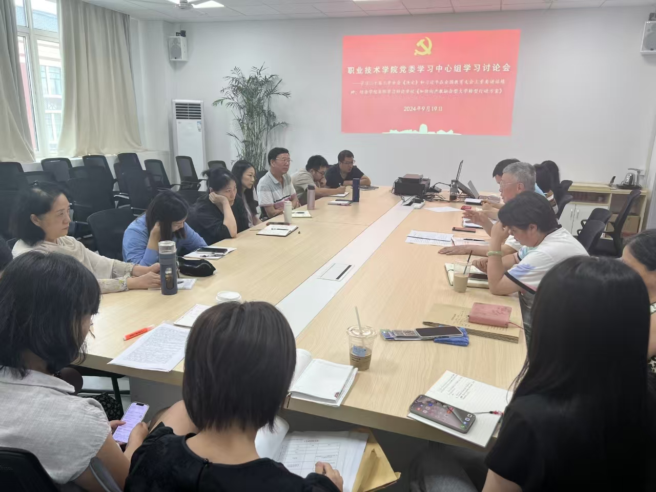 2024年9月20日下午,职业技术学院党委学习中心组集体进行专题学习讨论,党委书记王加宁首先介绍了本次中心组学习的主要内容为二十届三中全会《决定》和习近平在全国教育大会上重要讲话精神,包括“构建支持全面创新体制机制”和”开展新一轮的教育综合改革“相关内容。院长谷伟根据学校《加快产教融合型大学转型行动方案》内容结合工作实际做了主要发言,与会成员结合专业即兴交流发言。