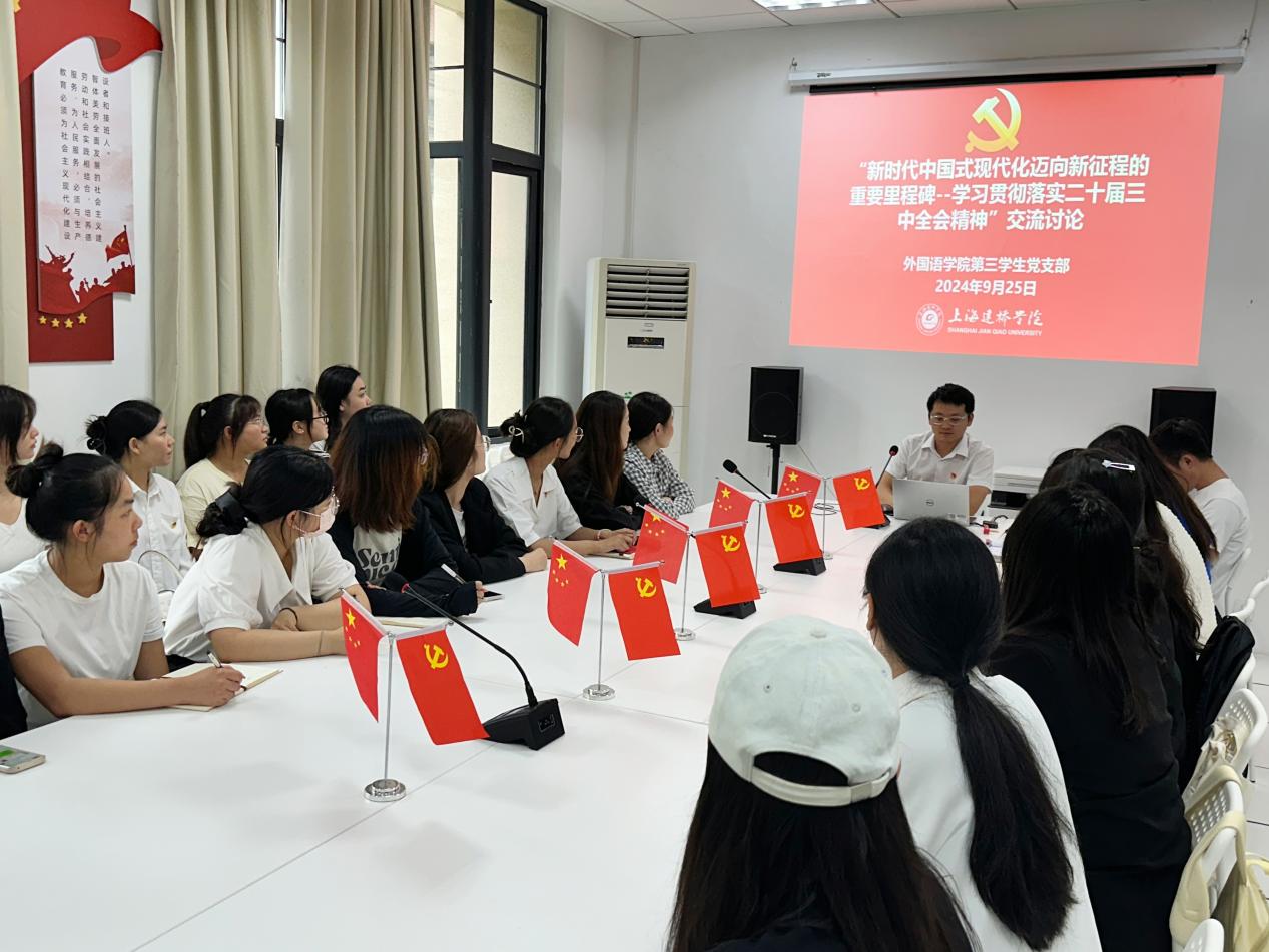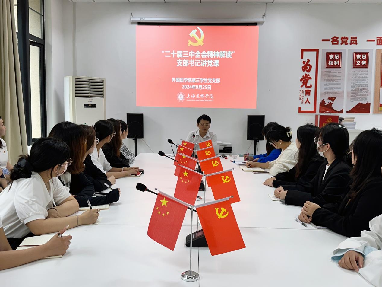 为进一步学习贯彻二十届三中全会精神,加强党员同志对党的二十届三中全会精神的深刻理解,推动全会精神深入人心、落地生根,2024年9月25日下午,外国语学院第三学生党支部于外院303开展“二十届三中全会精神解读”支部书记讲党课活动,并组织全体党员就“学习贯彻落实二十届三中全会精神”进行交流研讨。会议由第三学生党支部书记吴多发主持,第三学生党支部全体党员参加会议。