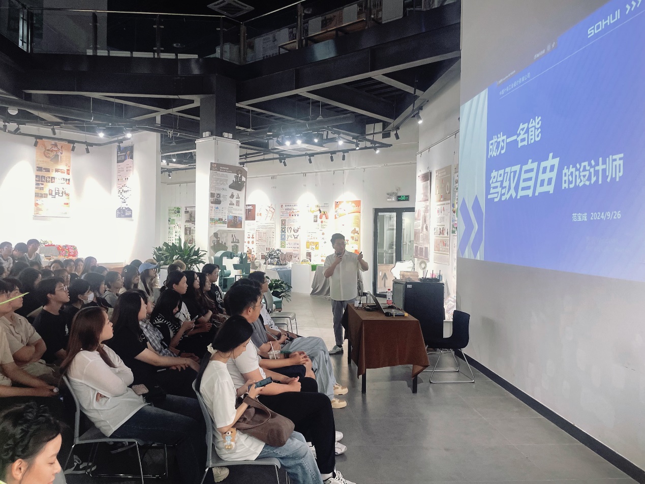 溯洄设计范宝成总经理以其丰富的设计经验和行业视角,为学生们描绘了未来优秀设计师的蓝图,以及面向未来的产品设计发展趋势。作为“2019年中国设计业青年百人榜”入选者,范总经理分享了他与中国科学院、张小泉等企业的合作经验,鼓励学生们从传统文化和现代科技中汲取灵感,勇于创新,不断突破设计的边界,追求卓越的作品。他独特尖锐的专业视角、幽默风趣的讲座风格、高互动性的讲座内容很快吸引了同学的踊跃互动,同学们也亲切地称其为宝总,宝总在讲座中也强调了在当今数质化浪潮下,产品设计不仅是外观和功能的结合,更是用户需求与科技创新的交汇点;在快速变化的市场环境中,设计师必须具备敏锐的洞察力和强大的技术基础,才能在全球化竞争中脱颖而出。