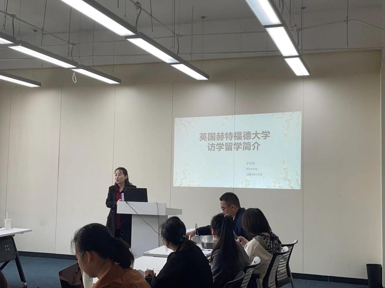 紧接着,雅思教学中心于文华主任向大家分享自己在英国访学及攻读博士的心得体会。于老师指出,在赫特福德大学的博士求学生涯充满了挑战,但同时也锻炼了自己的抗压能力、逻辑思维和多元价值观,希望自己的经历能够激励老师们追求学术的梦想。另外,于老师还分享了海外生活的多彩片段,“博士生涯的结束是新阶段的开始”,表达了对市教委强师工程项目和学校给予大力支持的感激之心,也对未来雅思教学充满信心。