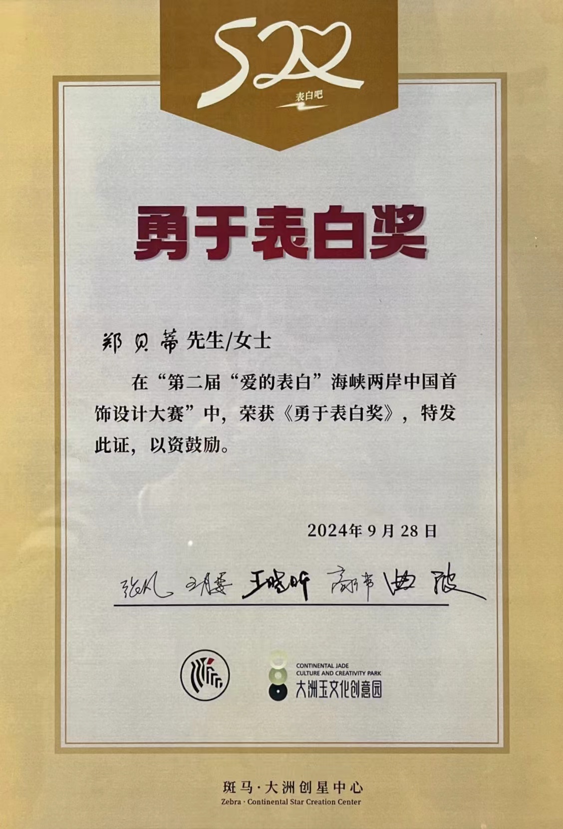 近日,珠宝学院产品设计系(珠宝首饰)的张锦彩老师在第二届“爱的表白”海峡两岸中国首饰设计大赛颁奖典礼上大放异彩。此次大赛由北京市大洲玉文化创意园和中国宝玉石垂直领域自媒体平台斑马先生联合主办,得到了包括北京市台办、北京市台联、中国宝玉石协会等在内的多家单位的大力支持。