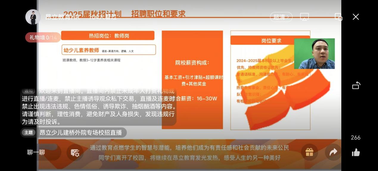 为切实做好2025届毕业生就业工作,构建毕业生与用人单位的交流平台,促进2025届毕业生高质量就业,我院于2024年10月31日晚上,邀请了我院校企合作单位上海昂立教育培训有限公司在微信直播上开展了招聘宣讲会。昂立校招负责人李源举、招聘主管高晓冬出席了本次宣讲,2025届毕业班辅导员、2025届毕业班学生112名学生参加,会议由学院就业横向工作负责人吴多发老师主持。