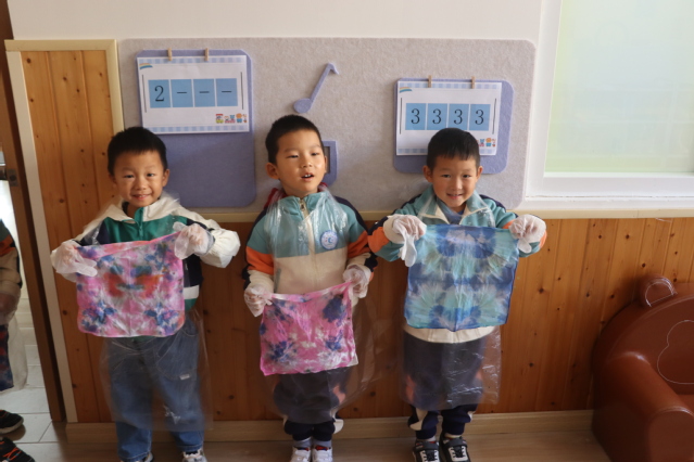 随后,志愿者们细心地为每一位孩子穿戴手套和围裙,做好扎染准备。刘晓老师进行扎染讲解,孩子们在志愿者带领下积极探索,亲自动手创作。他们用小手将染料浸透染布,制作出一幅幅独特且精美的图案,一布一型,一扎一染,皆是传承。