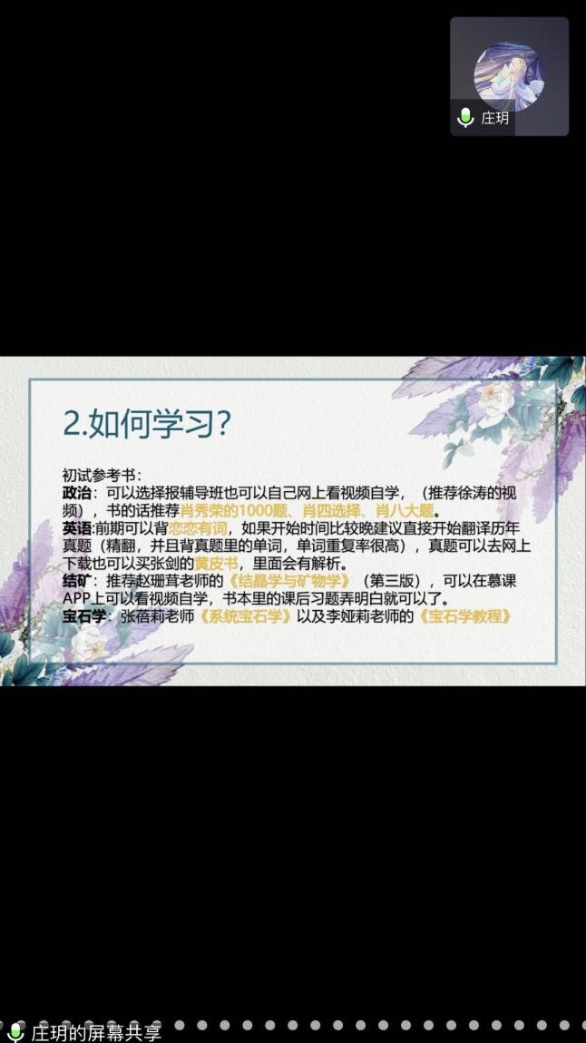 本次邀请20届校友作考研分享会解决了同学们关于考研的迷茫与疑惑,为接下来备战考研的珠宝学子提供了实用经验,极大的增强了21届珠宝考研人的信心,充分发挥了优秀考研生的示范引导作用,同时也给有考研意向的同学们指明了方向,营造了浓郁的学习氛围,有效促进了珠宝学院考研引导教育的实效性以及良好学风的建设。