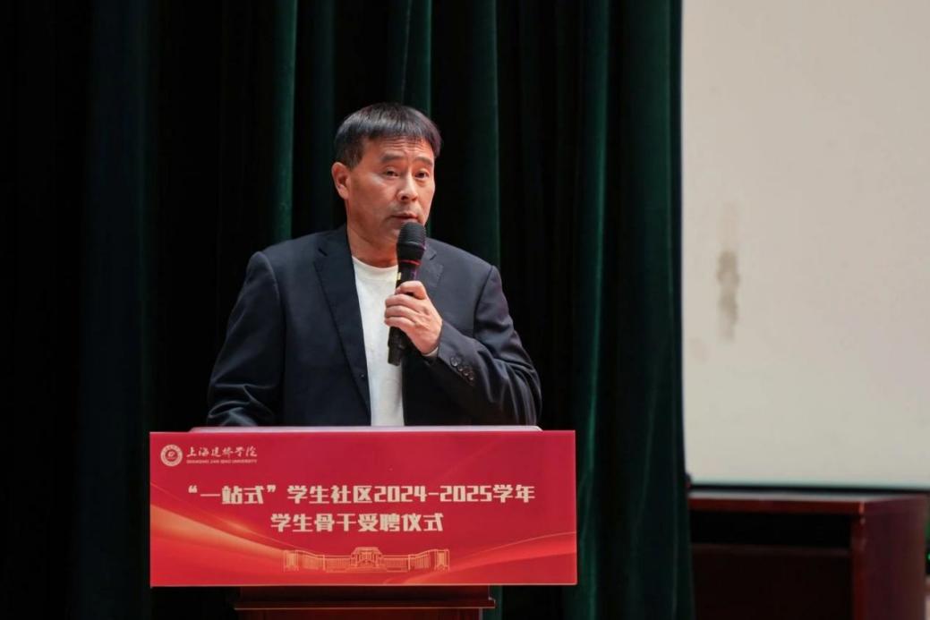 第二项议程,由“一站式”学生社区中心主任高祺宣读2024-2025学年“一站式”学生社区学生骨干名单,她表示:“一站式”学生社区的建设,围绕学生、服务学生、依托学生。自2024年3月至今,“一站式”学生社区中心共吸收了389名学生骨干,其中包含社区党建中心100人、园区党工站53人、楼层长236人。