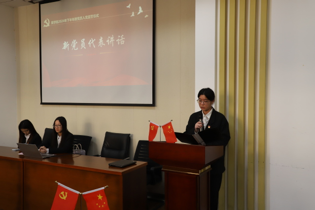 接着,新党员代表王婧同学发言。她说,作为一名新党员,在党旗下宣誓不仅是一份政治誓言,更是一份责任担当。这不仅是新党员个人政治生涯的重要时刻,也是人生道路上的新起点。她表示,从此刻起,新党员们将更加严格要求自己,不断提高自身素质和能力水平,努力让自己成为符合社会发展的高质量人才,以实际行动践行党的宗旨,让青春在为祖国、为人民的奉献中焕发出更加绚丽的光彩。