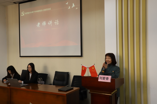 首先,刘爱香书记代表学院党委对新党员同志们表示热烈的祝贺和诚挚的欢迎。刘爱香书表示入党宣誓是政治生命的一个重要里程碑,意味着将肩负起更为重大的责任与使命,鼓励大家将入党作为人生的新起点,不忘初心、牢记使命,在学习、工作和生活中发挥先锋模范作用,努力成为有理想、有本领、有担当的时代新人。同时,对新党员提出了四点要求,一是要坚定理想信念,做对党忠诚的信仰者。要用党的先进理论武装自己的头脑,坚定对马克思主义的信仰、对中国特色社会主义的信念、对实现中华民族伟大复兴的信心。增强“四个意识”、坚定“四个自信”、做到“两个维护”,坚定不移听党话、跟党走。二是要勤奋学习知识,做追求卓越的奋进者。不断适应时代发展需求,拓宽知识领域,提高理论素养和实践能力,以更好地服务人民、服务社会。三是要勇于担当作为,做时代发展的开拓者。作为新时代的青年大学生党员,要积极投身中国式现代化建设,积极参与社会实践、志愿服务等活动,在实践中锻炼提升自己,敢于担当重任,用实际行动诠释共产党员的初心和使命。四是要严守纪律规矩,做廉洁自律的示范者。要时刻牢记自己的党员身份,自觉遵守党的纪律和规矩,自觉接受党组织的教育、管理和监督。充分发挥党员的先锋模范作用,以良好的形象和作风影响身边的同学,带动更多的青年学生积极向上、奋发有为。