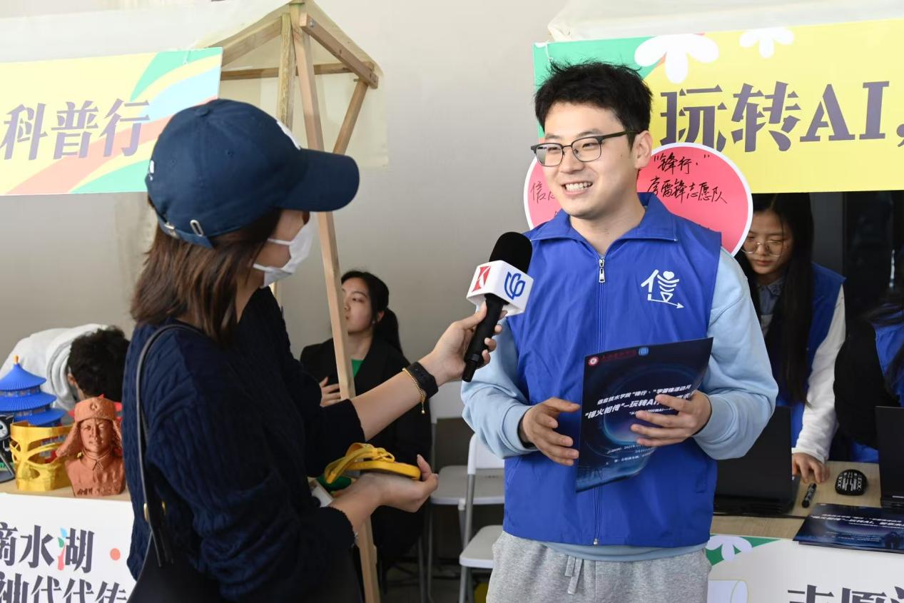 志愿者为杨书记讲解了融合AI技术的活动特色,此时恰逢东方卫视记者到场采访。面对镜头,杨书记表示:"新时代学雷锋既要传承'螺丝钉精神',也要善用人工智能等创新工具。通过科技志愿服务,我们正在探索思政教育与社会实践深度融合的新路径。"