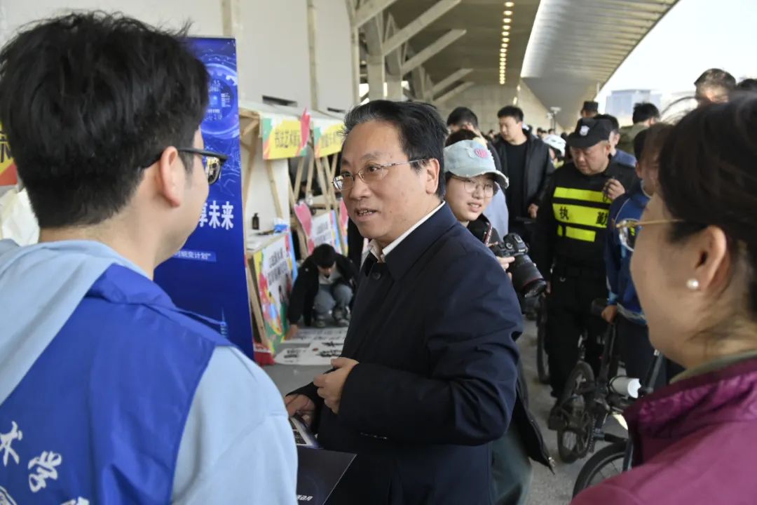 活动开始不久,上海建桥学院党委书记杨伟人来到志愿者摊位前,与参加服务的志愿者深入交流,志愿者为杨书记讲解了活动特色,杨书记也鼓励大家刻苦学习,积极继承和发扬雷锋精神,为社会,为国家作出自己的贡献,发挥小螺丝钉的重要作用。