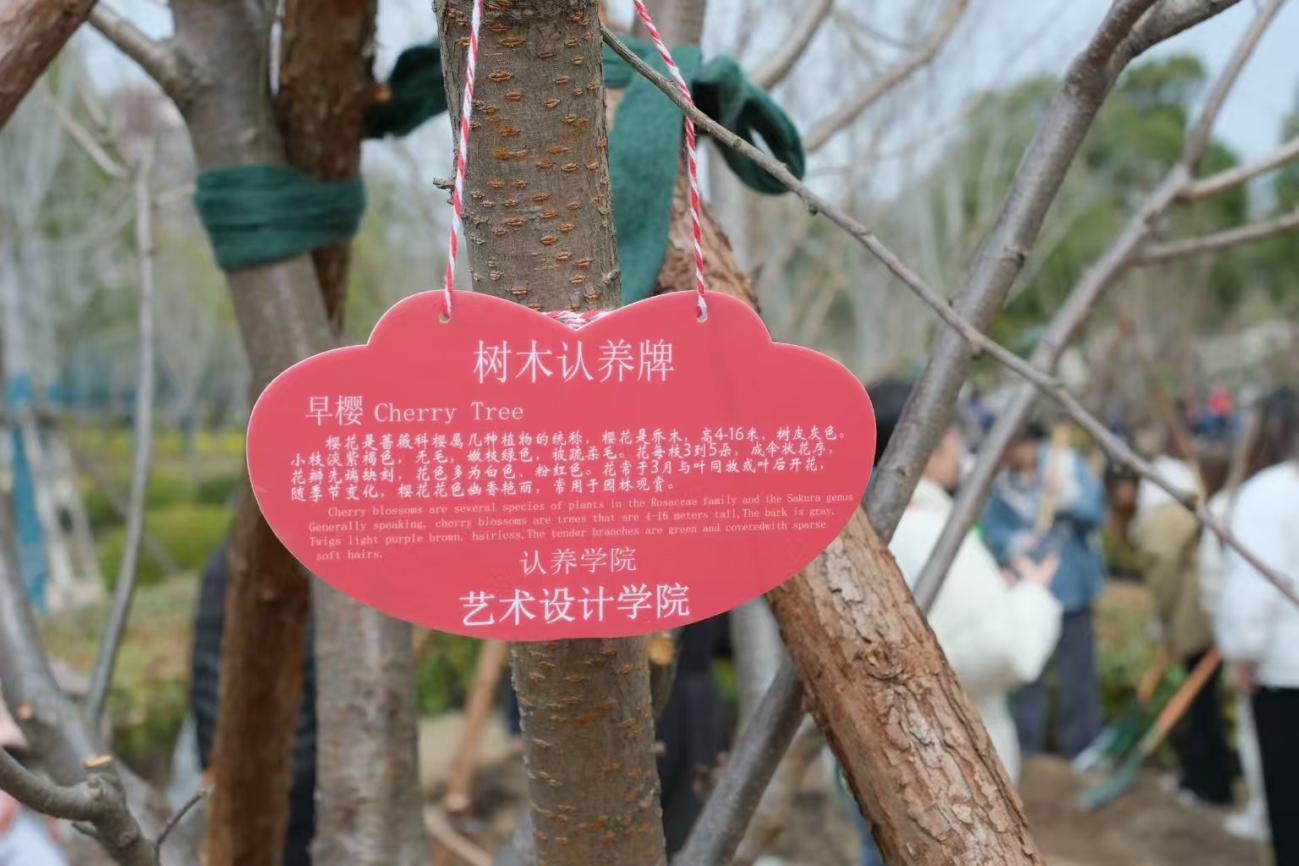 活动最后,学院党委书记周智明、副书记王丽佳亲自为早樱树苗挂上了学校特制的认养牌。两块熠熠生辉的牌匾上,“艺术设计学院”几个大字苍劲有力,在阳光的照耀下,散发出夺目的光彩,仿佛在向这片土地宣告着学院对绿色生态的执着与坚守。