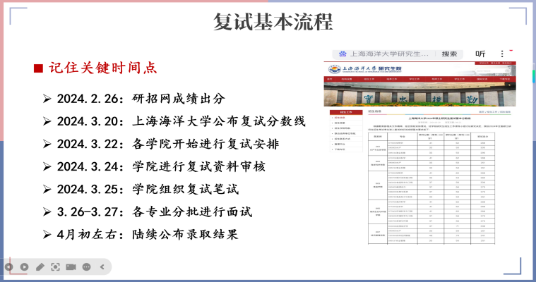 陈琛详细介绍了复试全流程。她指出,面试时要着装得体、举止大方,保持良好的精神面貌;回答问题应逻辑清晰。同时分享了心态调整的经验,她回忆自己复试期间也承受巨大压力,建议大家合理安排时间,制定科学复习计划,避免考前突击导致焦虑,保持积极乐观心态是发挥出最佳水平的关键。