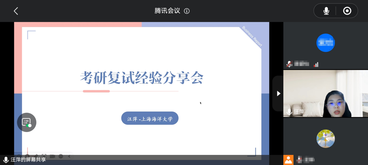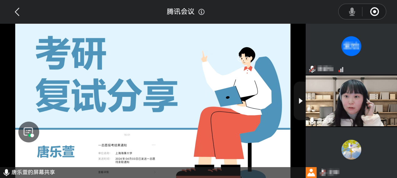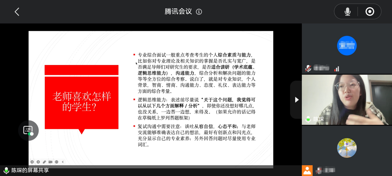 随后,陈琛、唐乐萱、汪萍三位优秀校友结合自身经历为大家分享备战考研复试的实战策略。
