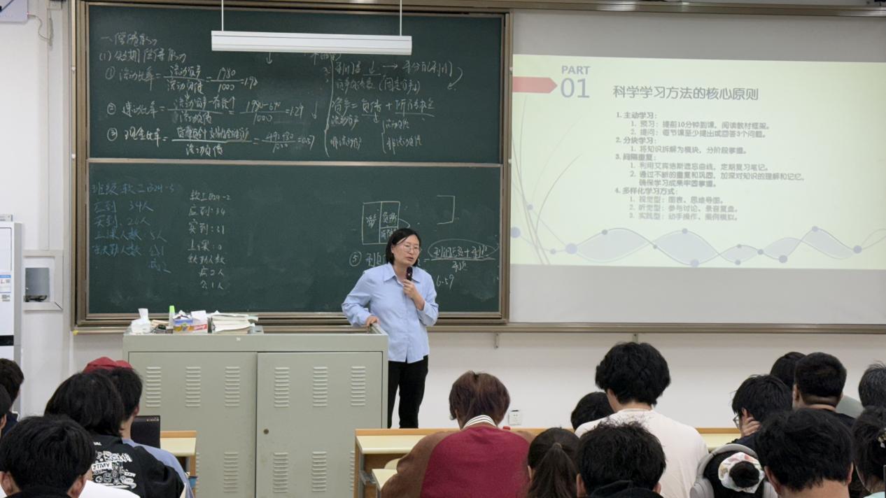 姜老师首先为同学们详细讲解了科学学习方法的核心原则。结合预习提问、分块复习和多元学习等科学方法,倡导同学提前10分钟预习教材框架并提出至少3个问题,以艾宾浩斯遗忘曲线进行模块化复习,配合思维导图、图表、讨论与案例模拟满足不同学习需求。姜老师提出,在上课时,同学们坐在前三排可有效减少干扰,同时采用康奈尔笔记法可规范课堂知识记录并主动参与讨论。课后,结合番茄工作法与四象限法合理规划学习与休息,通过每日小结与周末整合及时解决疑难,并充分利用图书馆、在线课程和学习小组互助答疑,可有效提升复习效率。