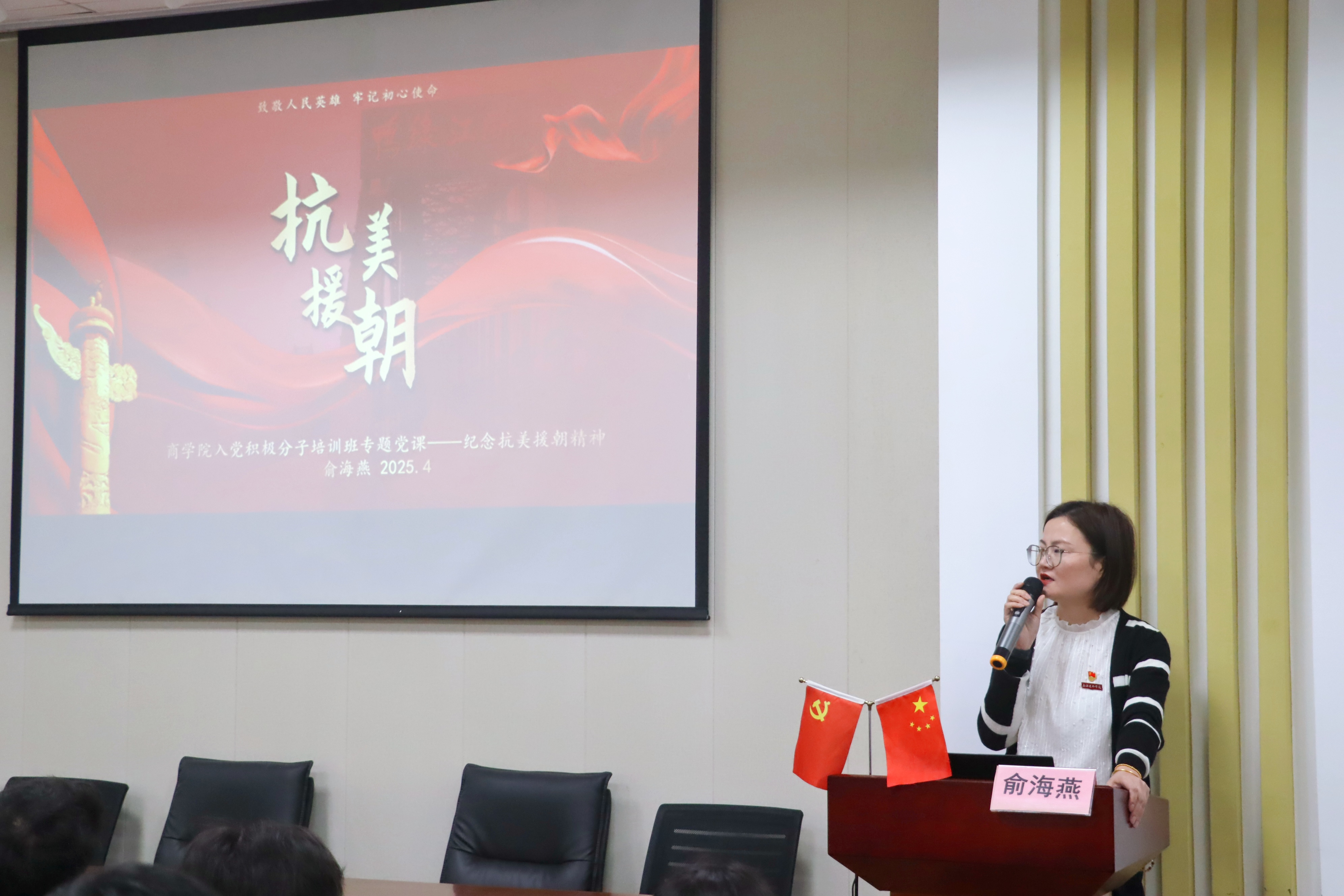 中国人民志愿军抗美援朝战争,是一段波澜壮阔、可歌可泣的伟大历史,承载着无数先烈的热血与奉献,铭刻着中华民族不屈不挠的精神丰碑。为纪念这一具有深远意义的历史事件,传承红色基因,弘扬英雄精神,4月17日下午,商学院党委副书记兼纪检委员俞海燕老师在商学院8323以“致敬人民英雄,牢记初心使命”为主题,为商学院分党校2025年第一期入党积极分子培训班授课。