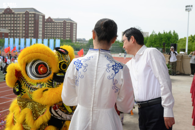 点睛醒狮环节将现场气氛推向高潮。校长朱瑞庭执笔为雄狮点睛,“一点天庭,建桥龙腾,体魄如虹贯长空;二点双眸,建桥星耀,慧眼灼灼尽风流;三点口利,建桥声威,呐喊声声震天雷。”寓意传承中华传统体育精神,开启校园体育新篇章。