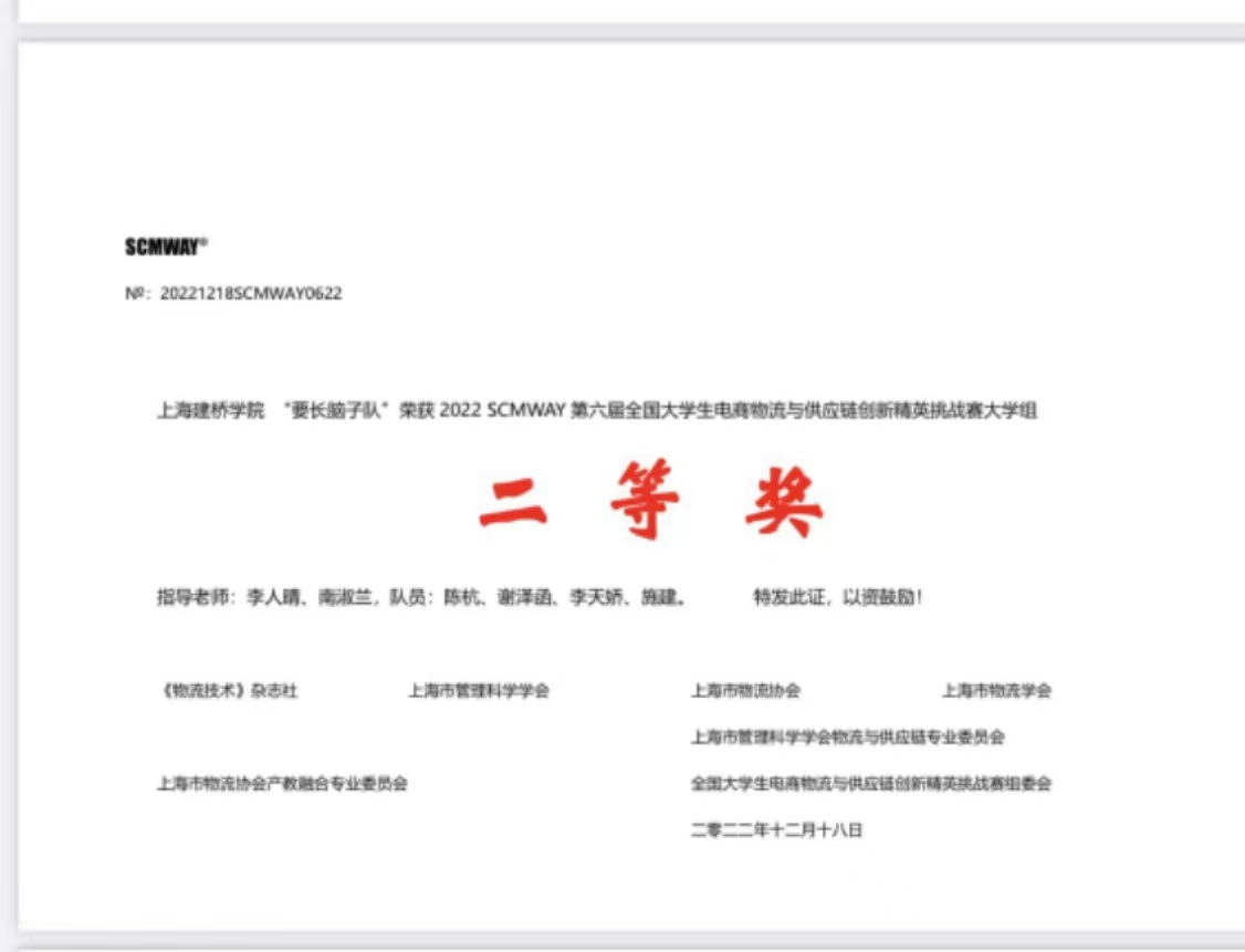 个人小传:施建,上海建桥学院商学院2025届毕业生,今年以优异成绩,考取复旦大学物流工程与管理专业硕士研究生。在校期间曾荣获特等奖学金、“弘扬雷锋精神”优秀学生金质奖章、优秀志愿者等荣誉称号,并荣获上海市绿色供应链与逆向物流设计大赛优胜奖,第六届全国大学生电商物流与供应链创新精英挑战赛大学组二等奖等竞赛奖项。