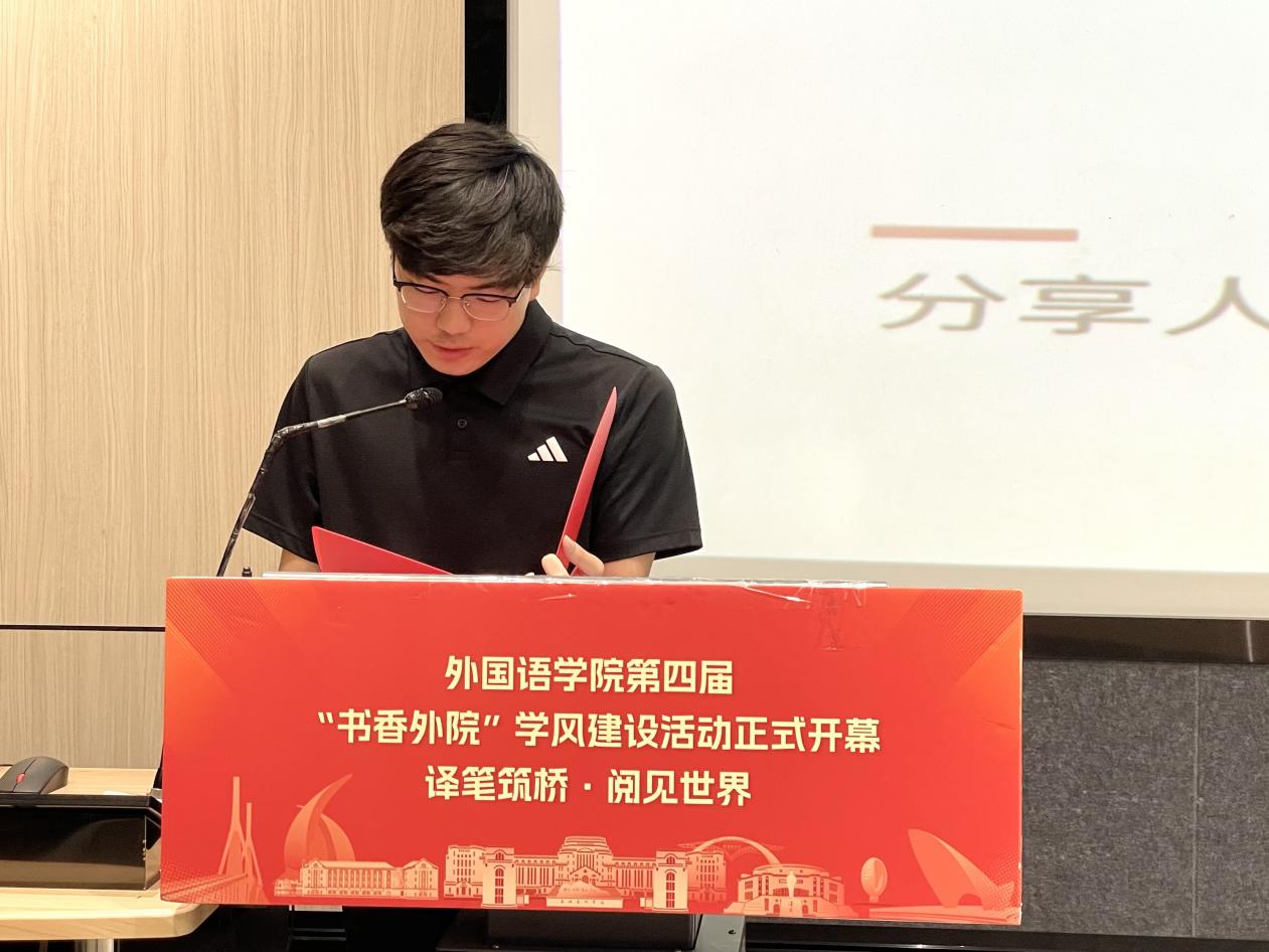 教师代表蒙兴灿教授的发言,从专业视角深入剖析了阅读在语言学习与国际传播中的重要意义。他呼吁师生们以书籍为舟,跨越知识的海洋,不断拓宽视野,锤炼专业素养,在阅读中积蓄力量,为未来的专业发展和国际交流做好充分准备。