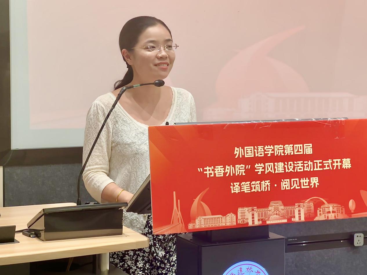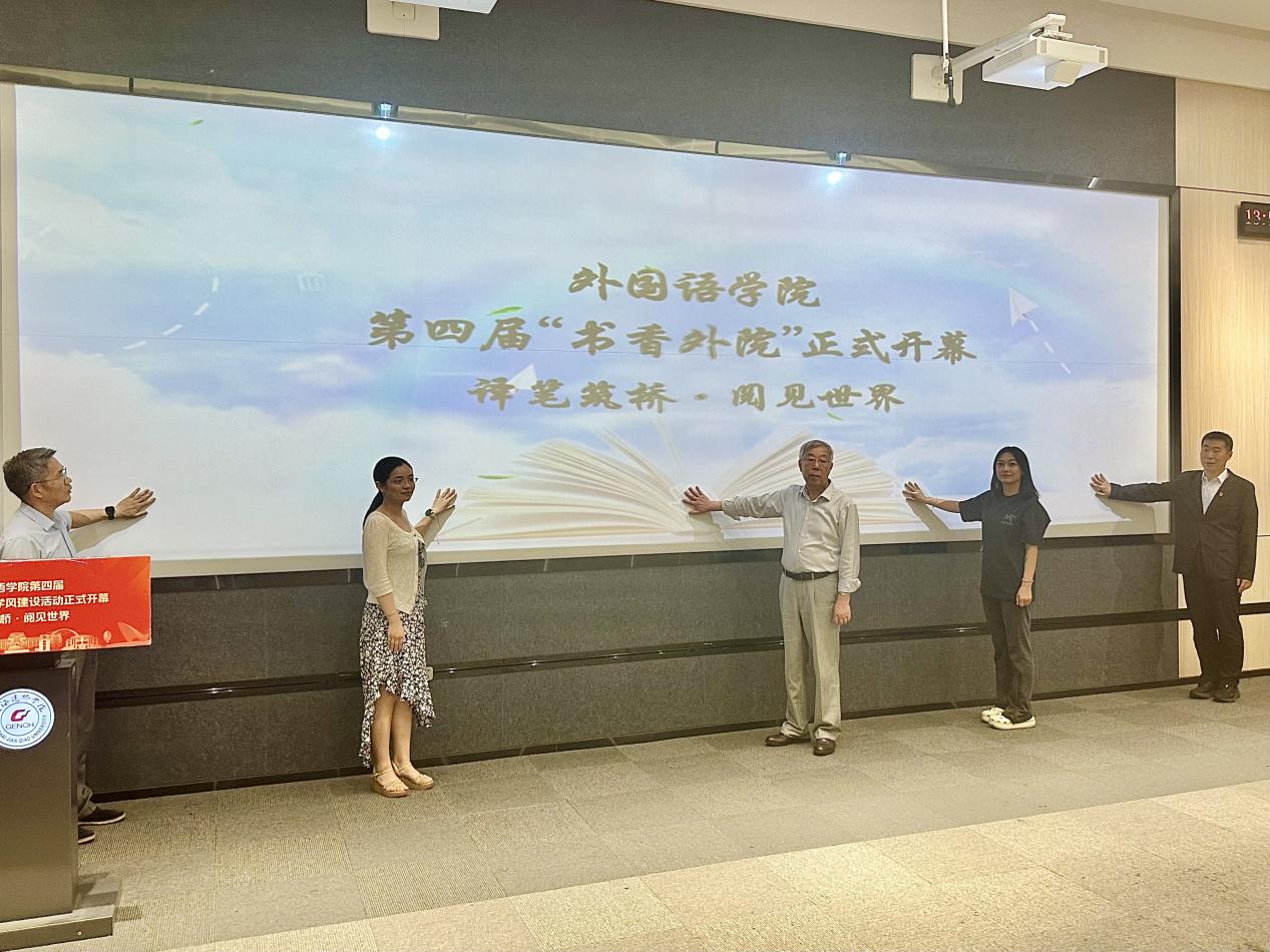 5月22日,外国语学院第四届“书香外院”学风建设活动开幕式在三教220教室举行。本次活动以“译笔筑桥,阅见世界”为主题,旨在厚植学院学风建设根基,营造馥郁浓厚的读书氛围,为师生搭建阅读与成长的桥梁,活动由党委副书记伊莉老师主持。