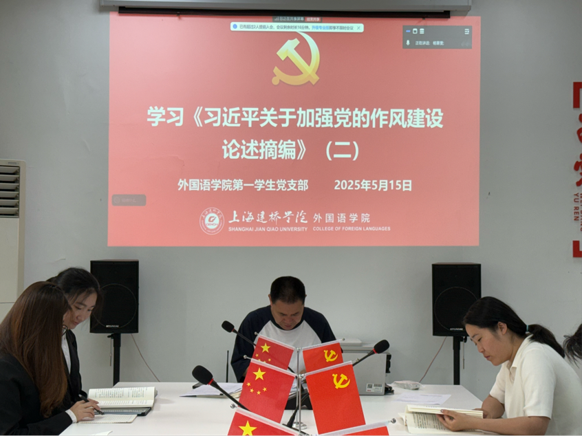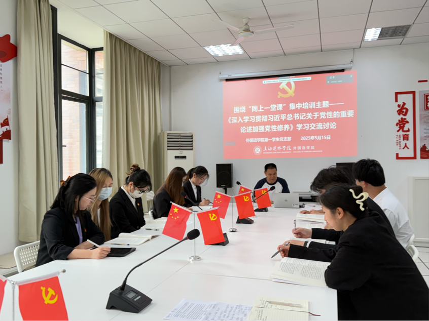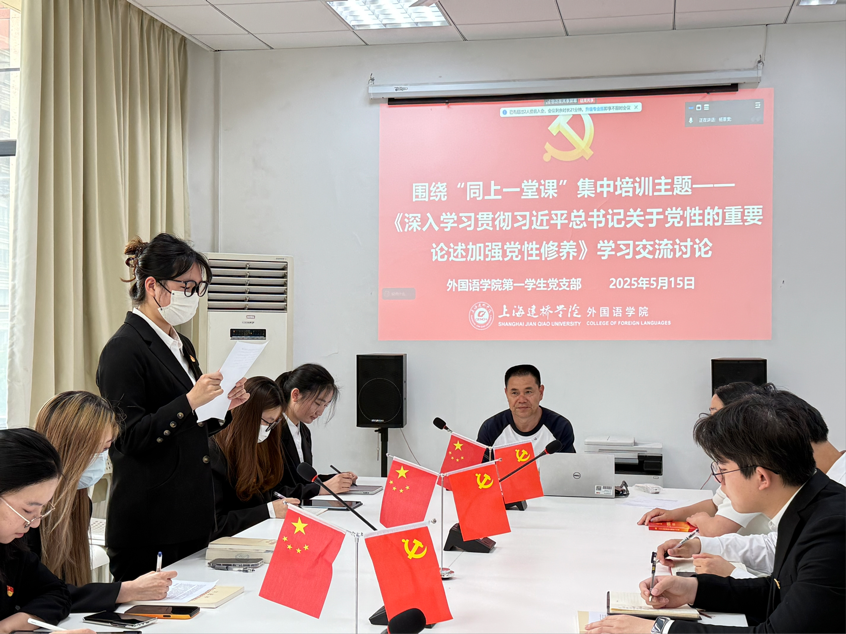 5月15日,外国语学院第一学生党支部围绕学校5月8日“同上一堂课”集中培训主题,开展《深入学习贯彻习近平总书记关于党性的重要论述,加强党性修养》、以及5月份第二次学习《习近平关于加强党的作风建设论述摘编》学习交流讨论。会议由支部书记赵磊主持,全体党员参加。