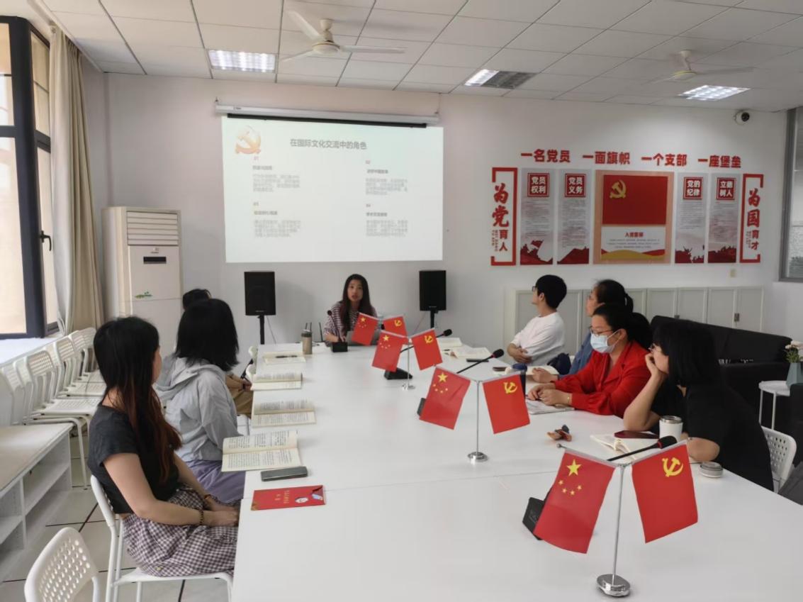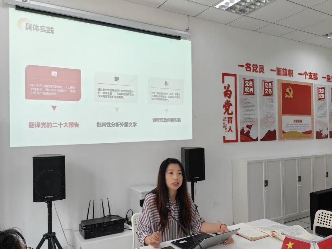在之后的支部书记讲党课环节,周杨书记以“立足专业特色,锤炼共产党员的党性修养”为主题,从共产党员的使命、党性的核心要义、案例分析、具体实践四个方面为党员们带来了一场深入浅出的专题党课。周杨书记指出,外语教师肩负着为党育人、为国育才,培养具有全球视野的社会主义建设者的使命。党员教师要通过塑造学生品格、提升综合素质,培养学生成为国家栋梁之才,同时在国际舞台上传播中华文化,增进世界对中国理解。在案例分析环节,周杨书记结合具体教学实例,深入剖析了外语教学中需要注意的政治纪律问题。她特别提醒:在讲解外国文学作品时,要引导学生辩证看待其中的价值观;在课堂讨论中,要把握好学术自由与政治底线的边界。在具体实践部分,周杨提出了深入学习并精准翻译党的二十大报告关键表述、批判性分析外国文学作品中的“普世价值”、开展“用外语讲中国故事”活动等具体实践方式,引导党员教师在教学中实现知识传授与价值引领的有机统一。同时,提醒党员教师警惕“重技能轻教育”“误解学术无国界”两种倾向,要在教学与研究中找到平衡点,既展现专业特色,又强化党性修养,培养全面发展的人才。