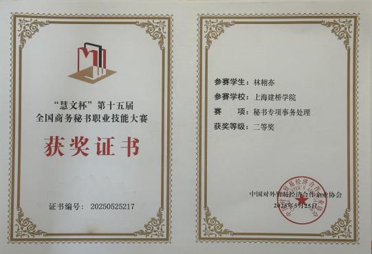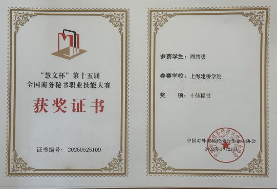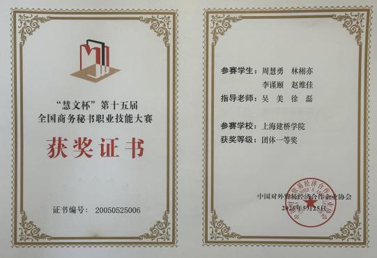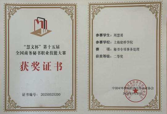 5月23日至25日,由中国对外贸易经济合作企业协会主办的“慧文杯”第十五届全国商务秘书职业技能大赛在云南能源职业技术学院成功举办。本次赛事汇聚了来自全国96所高校的400余名参赛选手,上海建桥学院代表队由秘书系主任吴美老师领队,率秘书学专业B23-1班四名精英学子参赛。经过激烈角逐,该代表队凭借扎实的专业技能与卓越的临场发挥,最终斩获团体一等奖殊荣。其中,周慧勇、林栩亦两位同学在秘书专项事务处理模块荣获二等奖,吴美、徐磊老师荣获“优秀指导教师”荣誉称号,周慧勇同学更以全面出彩的表现摘得“十佳秘书”荣誉称号。