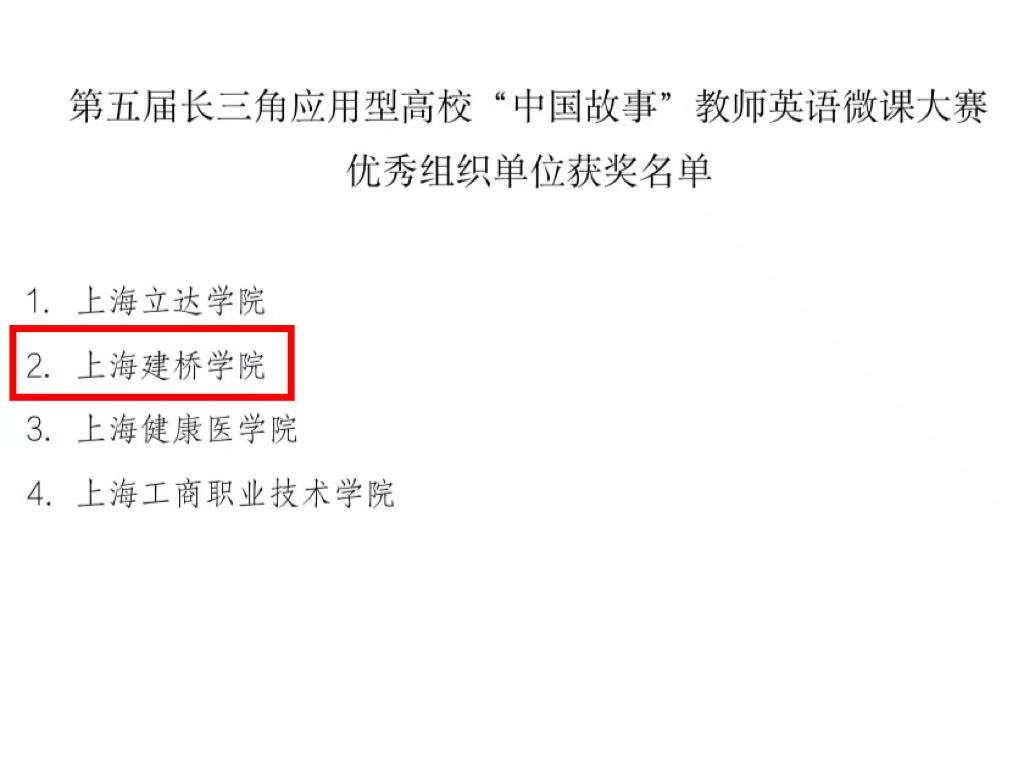 近日,由长三角教育一体化发展领导小组办公室总秘书处、中共上海市民办教育综合委员会、上海高职高专思想政治理论课建设联盟联合主办的第五届长三角应用型高校“中国故事”教师英语微课大赛暨第六届长三角应用型高校“中国故事”英语视频大赛于近日圆满落幕。外国语学院在此次赛事中取得了优异成绩,其中教师团队荣获英语微课比赛一等奖1项、三等奖1项、以及优秀组织单位奖,学生团队荣获英语视频大赛二等奖3项。