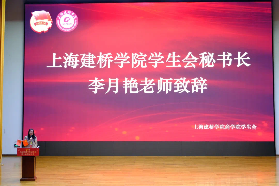上海建桥学院学生会秘书长李月艳老师在讲话中对商学院学生会过去一年的工作成效给予了高度评价,充分肯定了商学院学生组织在服务同学、促进发展方面取得的显著成绩。同时,李月艳老师对全体商学院学子提出殷切期望:要始终坚定理想信念、勇担时代使命,将个人发展融入学院建设。希望同学们以更加昂扬的姿态、更加务实的作风,在强国建设、民族复兴的新征程上书写属于商院学子的绚丽华章。