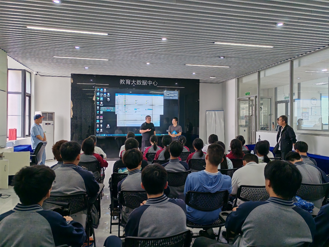 最后一站是信息学院,师生们先后参观了机房、实验室,听学长们分享学习经验,以及李洋老师准备的项目专题报告。在互动环节,同学们反应非常热烈,对大学生活的细节充满好奇。