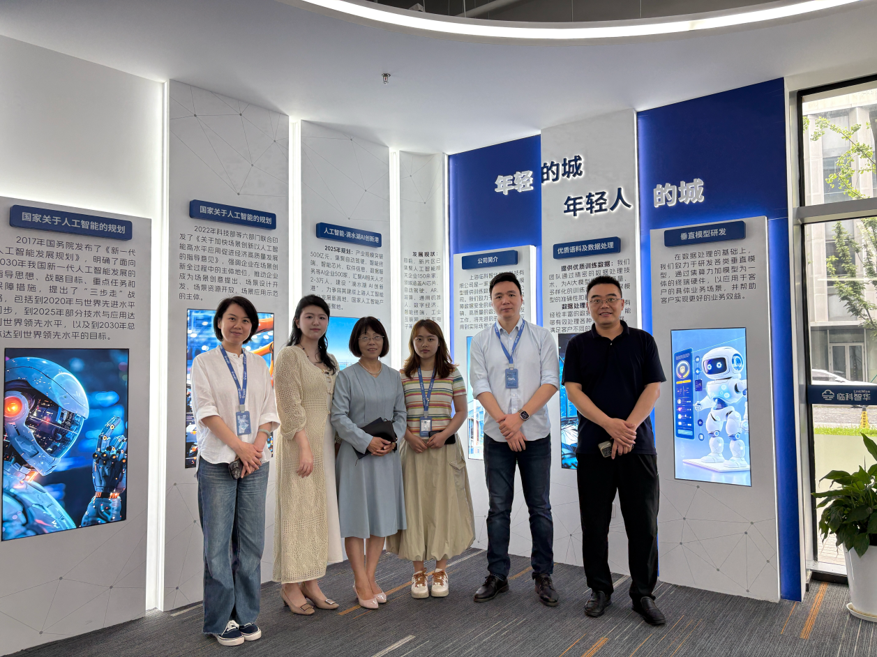 在走访活动中,老师们参观了临科智华的宣传展厅及办公环境,与在岗校友21级商务日语专业学生周梅见面交流。临科智华人事经理黄宜及数据总监李科向老师们详细介绍了公司在人工智能和大数据领域的最新研究成果和技术应用,包括数据处理流程、数据质量对模型质量的影响以及最新的计算设备等。老师们对临科智华在AI领域的技术实力和创新能力给予了高度评价。