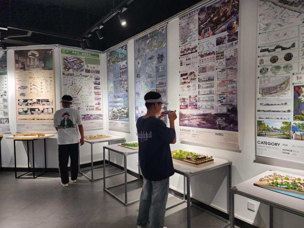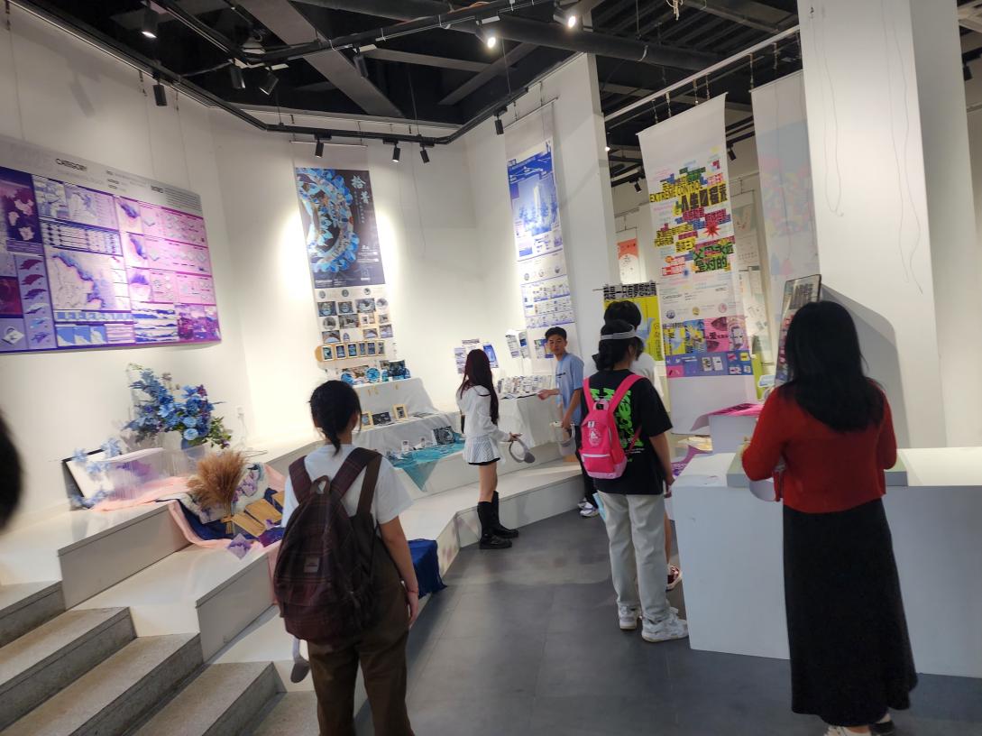 同学们逐一走进视觉传达、数字媒体、环境艺术、艺术与科技专业展区。各具特色的毕业作品或富有设计感、或技术与艺术融合、或富有社会议题引导,引发了学生们极大的兴趣。同学们时而驻足欣赏,时而热烈讨论,不少人拿出手机拍照记录,并与在场的讲解老师就作品背后的创作理念、设计手法及学习过程展开交流。