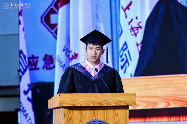 考入上海外国语大学外交学专业的优秀毕业生代表、外国语学院庞硕杰同学在发言中深情感谢母校的悉心培养。他表示,“感恩、回报、爱心、责任”的校训高度凝练了建桥精神,也深深影响和塑造了他的成长之路。他将始终铭记建桥人的身份,在未来的人生道路上,走得更高、更远。