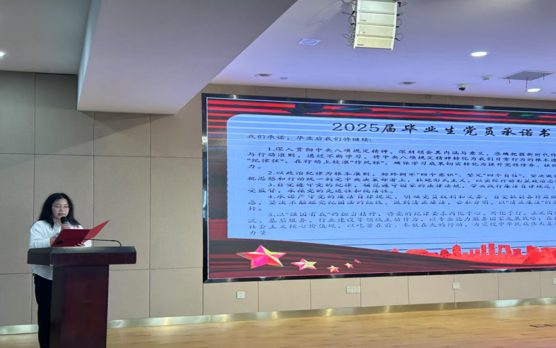 毕业生党员杨薏雯代表外国语学院2025届毕业生党员们宣读党员承诺书并签署《2025届毕业生党员承诺书》。全体毕业生党员将以“清正廉洁、服务社会”为行为准则,将深入贯彻中央八项规定精神融入学习、工作、生活各方面,筑牢爱国根基,扛起时代使命。