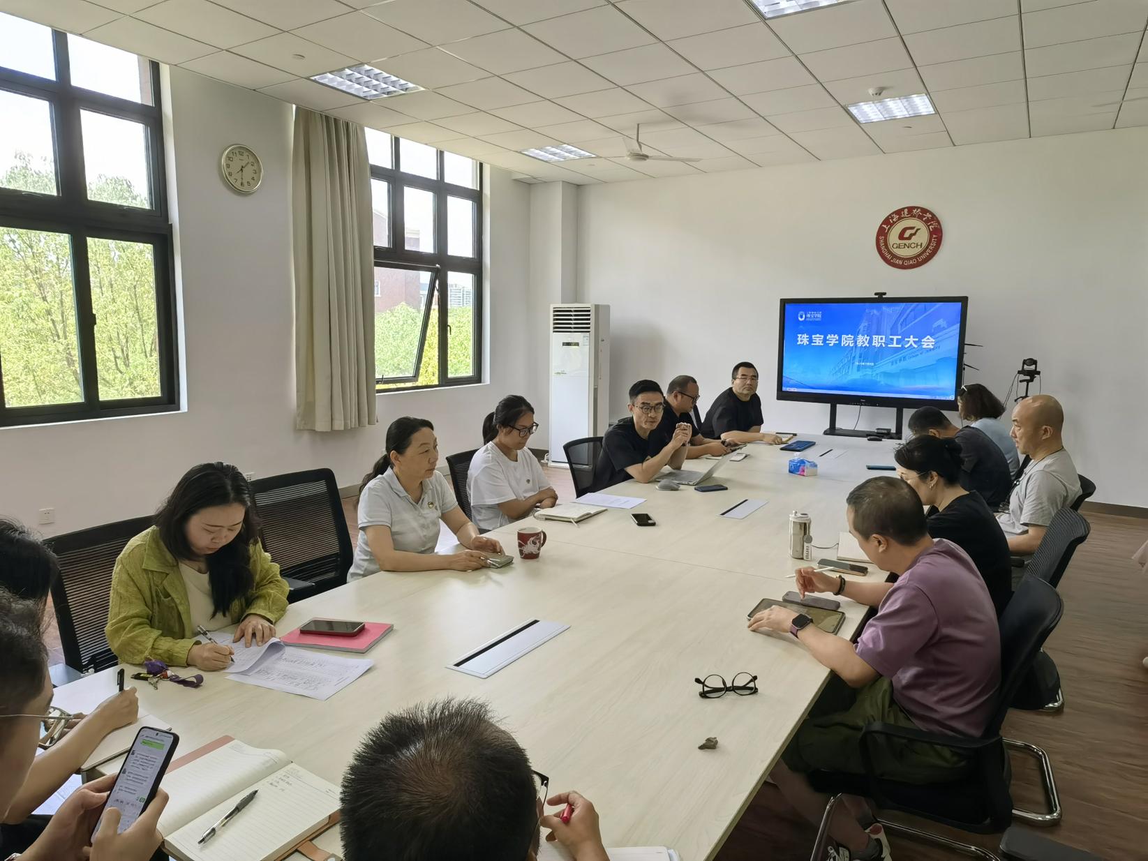 7月9日下午,珠宝学院召开全体教职工大会,全面总结本学期工作,重点部署“十五五”期间产教融合任务及暑期重点工作。珠宝学院院长刘衔宇、党总支书记王苇、教学副院长杨天畅、党总支副书记张晓寅出席会议,全体教职工参会。会议由刘衔宇院长主持。