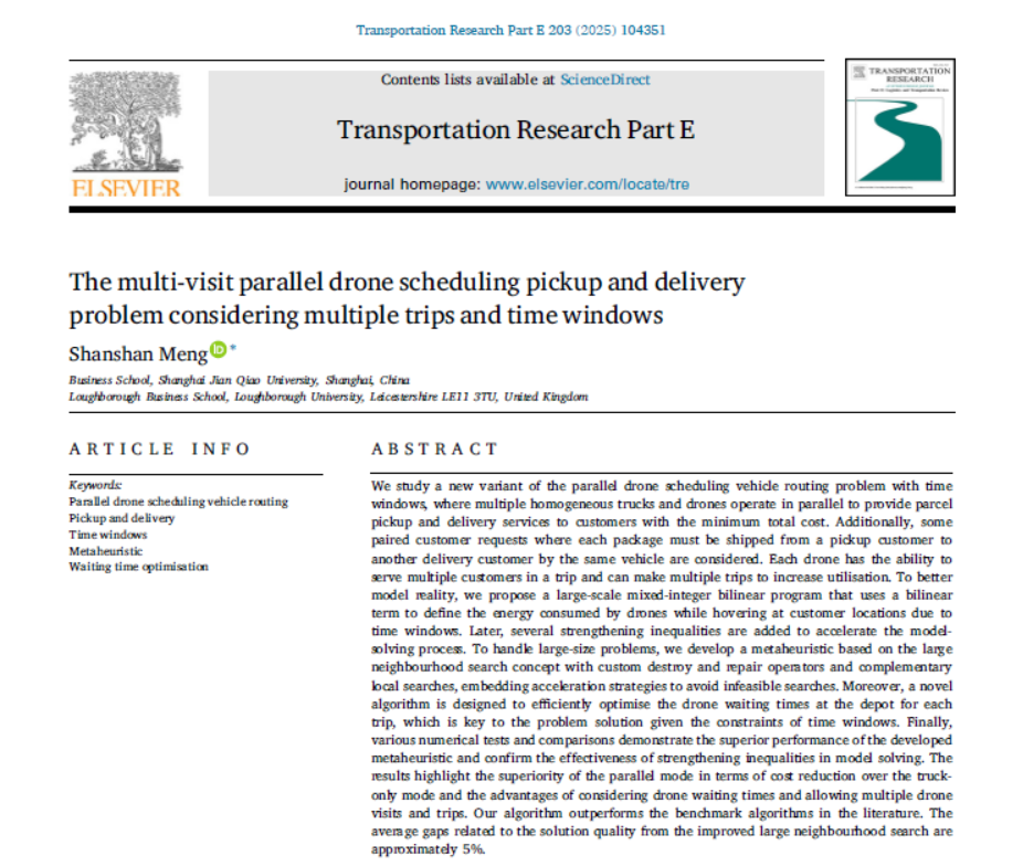 近日,上海建桥学院商学院孟姗姗博士在物流与交通领域国际顶级期刊《Transportation Research Part E: Logistics and Transportation Review》(TRE, SCI一区) 上,以独著身份发表了具有重要理论突破与实践价值的研究论文。该研究创新性地解决了无人机协同配送中的复杂调度难题,为蓬勃发展的即时配送、外卖物流等行业提供了高效优化的新思路。