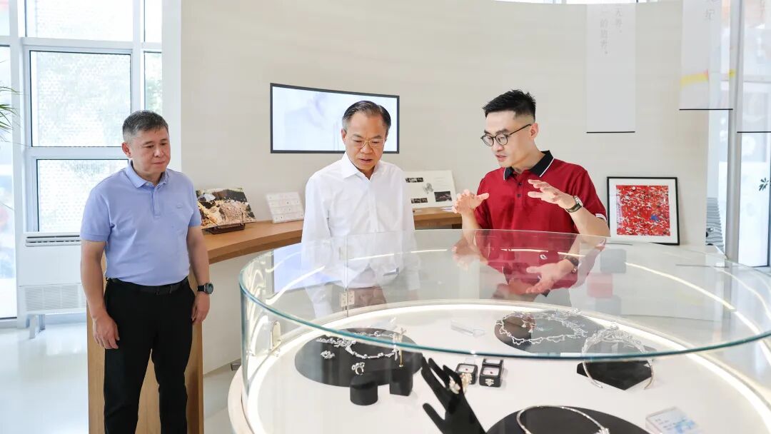 陈金山一行来到临湖珠宝艺术中心,详细了解学校“二级学院+产业学院+产业公司”合作模式。他指出,珠宝艺术是传统文化与现代消费的结合点,要提高珠宝中心体验功能,提高游客和公众参与度。