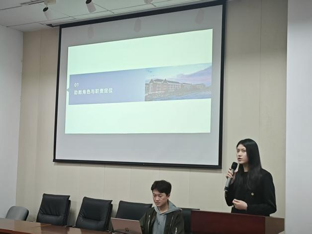 会议的第二项议程,由25级新助教代表发言,25级数学总助教刘可尧同学从为什么选择助教、对助教的认知、工作规划等方面分享了自己的思考与期望,他提到,之所以选择成为助教,是希望能够将这份爱心和知识传递给更多的新生。最后,他呼吁所有新助教秉持“朋辈帮扶,薪火相传”的精神,做一名合格的“小老师”。