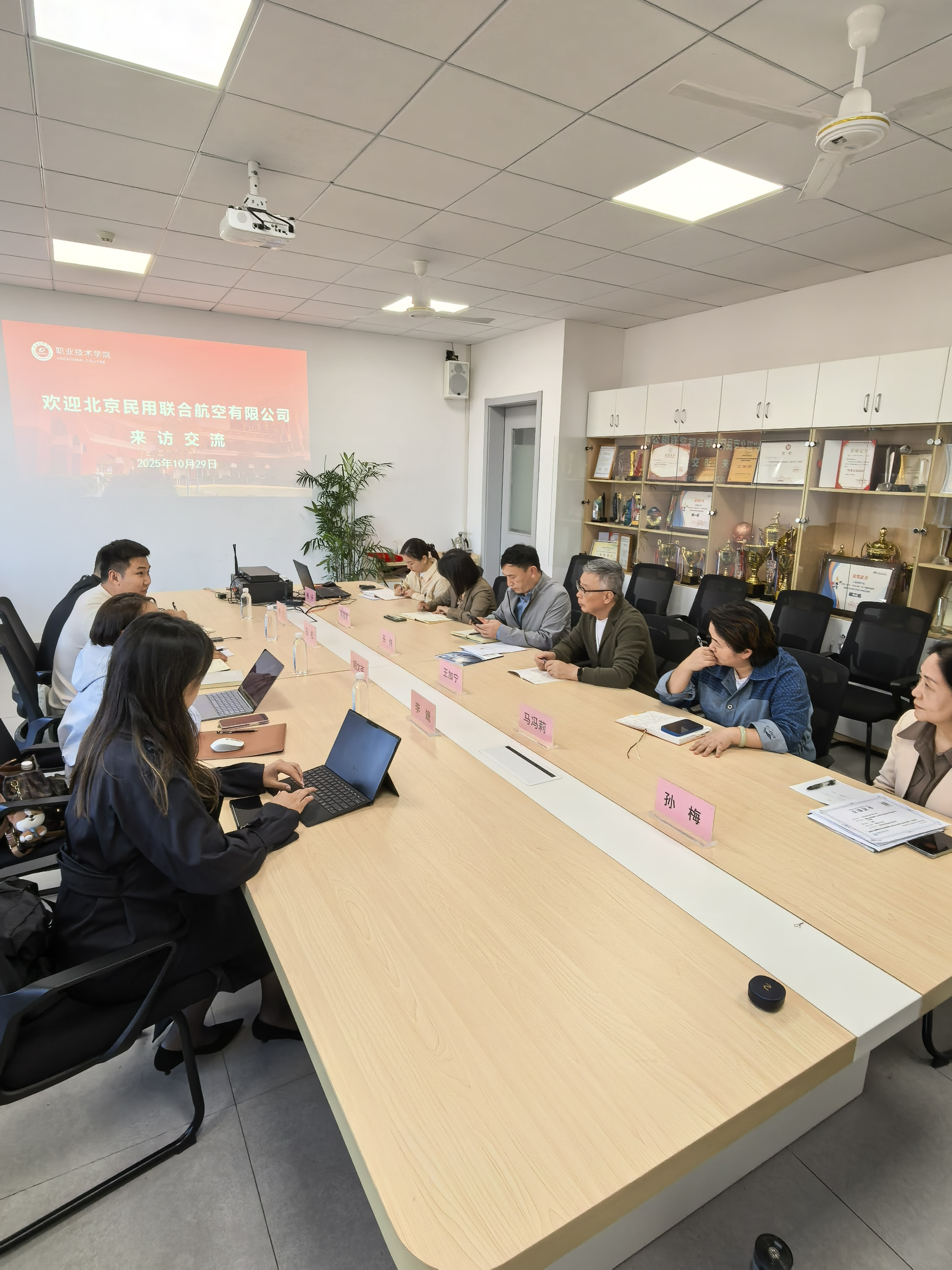 10月29日,北京民用联合航空有限公司(以下简称 “北京联航”)代表团队一行到访职业技术学院,围绕航空领域技术技能人才联合培养与学院展开座谈交流。学院院长谷伟、党委书记王加宁、副院长陈莲君、党委副书记马冯莉、航空系主任杨丹、实验室主任孙梅、继续教育学院李婕等7人出席座谈会议。