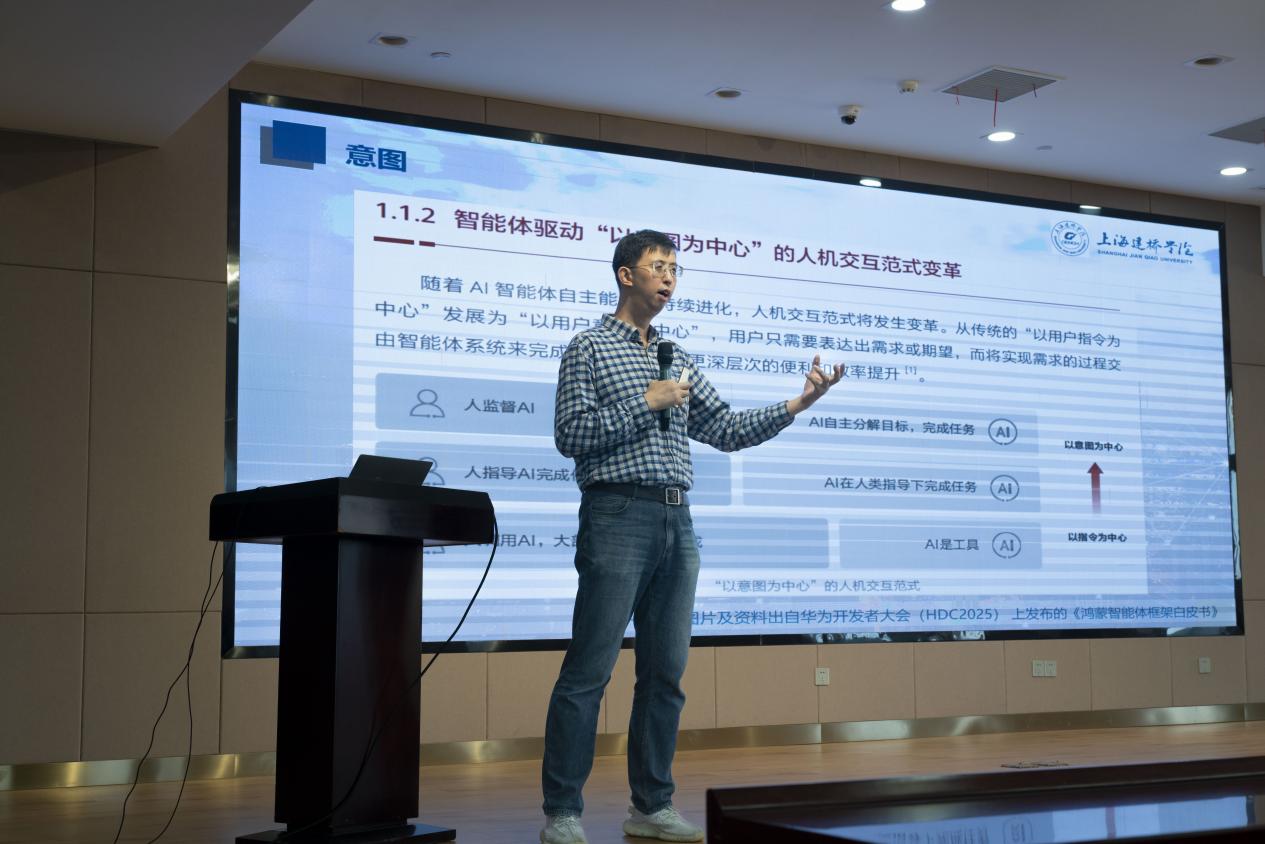 计算机科学与技术系系主任戴智明以《鸿蒙北向应用开发路径及趋势》开启技术分享。他梳理了学院近两年在鸿蒙领域的建设成果,包括校企合作项目落地、实验室建设进展及学生团队在国家级竞赛中斩获的多项奖项。通过解析HarmonyOS系统架构,戴智明阐释了鸿蒙的三大特性及特性背后的深远影响,介绍了如何区分南向(底层硬件适配)与北向(应用层开发)的技术边界。针对学生关切的鸿蒙北向应用开发学习路径问题,他特别结合华为开发者联盟的官方文档智能客服的使用,到官方的AI插件CodeGenine对鸿蒙学习和开发带来的帮助、Cursor在实际开发中的重大作用,引导学生去积极尝试AI工具,主动拥抱技术的变化。在报告的最后,又聚焦AI Agent时代的技术变革,指出鸿蒙应用正从指令响应向意图理解进化,这一趋势将重塑智能终端的交互逻辑。