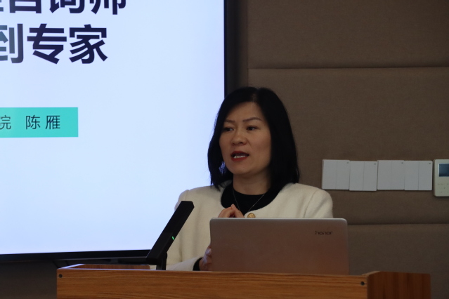 上海市就业指导志愿专家团专家陈雁副教授以《高校生涯咨询师:从入门到专家》为题作报告。她通过案例和分享的方式,让学员了解生涯咨询的基本概念,掌握生涯咨询的流程;她重点讲解了生涯咨询过程的具体内容,让学员对生涯咨询有比较全面的了解,从而把它运用到学生工作中。