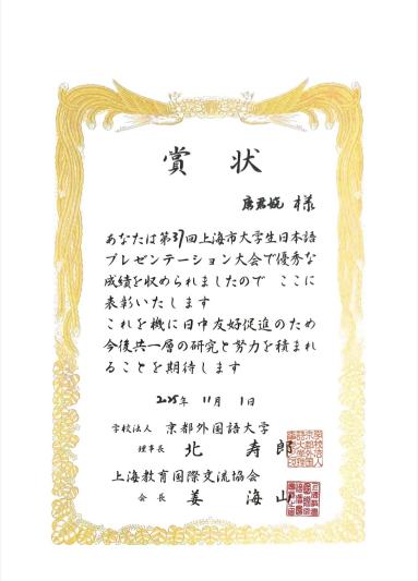 尽管面对来自复旦大学、上海外国语大学等多所知名院校的强劲对手,唐君娆同学仍沉着应战,在演讲内容、语言表达及综合展示等方面均表现出色。她表示:“能够与上海各大名校的同学同台竞技,本身就是一次宝贵的学习机会。虽然这次只获得了参与奖,但整个过程让我受益匪浅,也看到了自己未来努力的方向。”