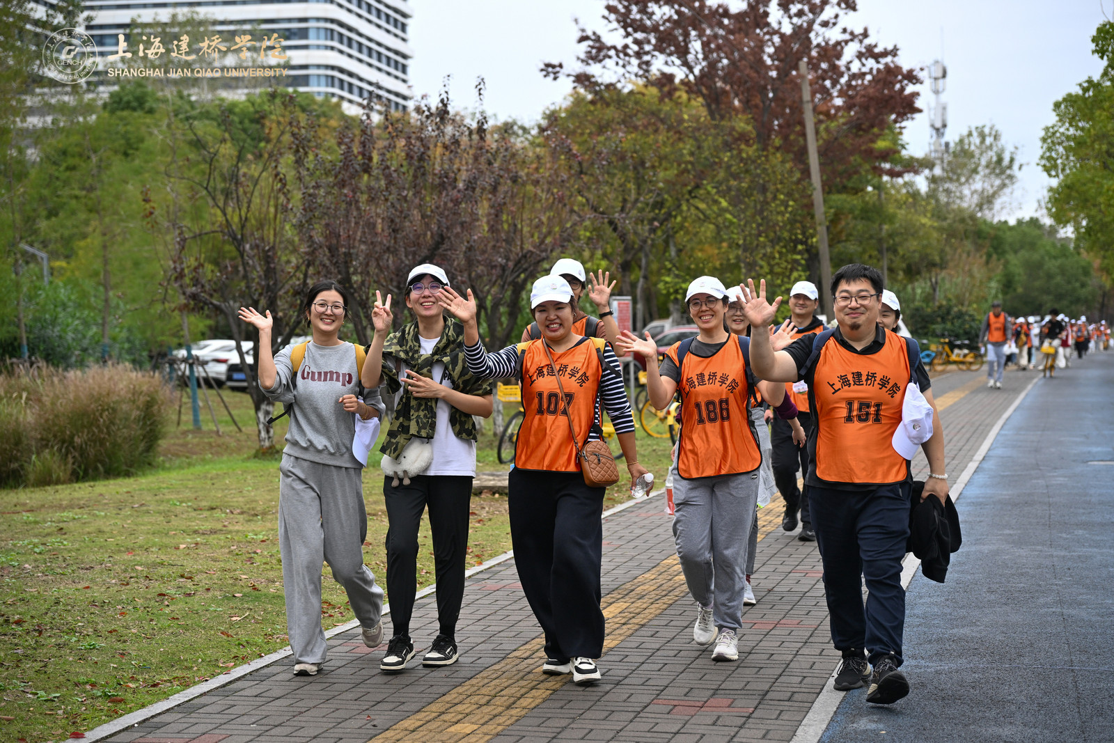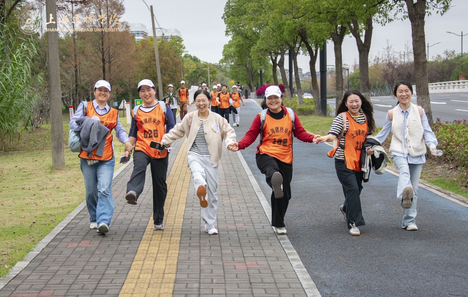 在健步走热身环节,体育部赵龙龙老师带领全体参与者进行了八段锦热身。参赛选手们按分工会为组别依次出发,穿着印有“上海建桥学院”标识的橙色马甲,穿梭于秋色斑斓的树荫大道,形成一道流动的风景线。队伍沿途经橄榄路、沪城环路、海港大道,海基六路,见证海洋大学、海事大学、海立方、信息飞鱼园区、智能网联汽车综合测试示范区等临港现代化地标,全程6.3公里。道路两侧层林尽染,树叶在秋风中沙沙作响,与教职工们的欢声笑语交织成一曲动人的秋日交响。