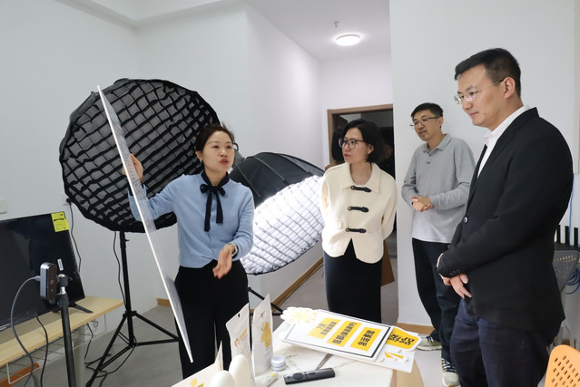随后,一行人走进学院的专业直播间,实地考察直播教学实训场地的建设情况。鄢霞院长讲解了直播间的设备配置、场景搭建、运营技巧及实训课程的开展模式。上海电力大学的老师们近距离观察了直播实训的真实场景,对直播间兼具教学、实训、创业孵化等多重功能的设计理念表示赞赏,并不时就直播人才培养过程中的实践教学安排、校企合作项目对接等内容与对方交流经验。