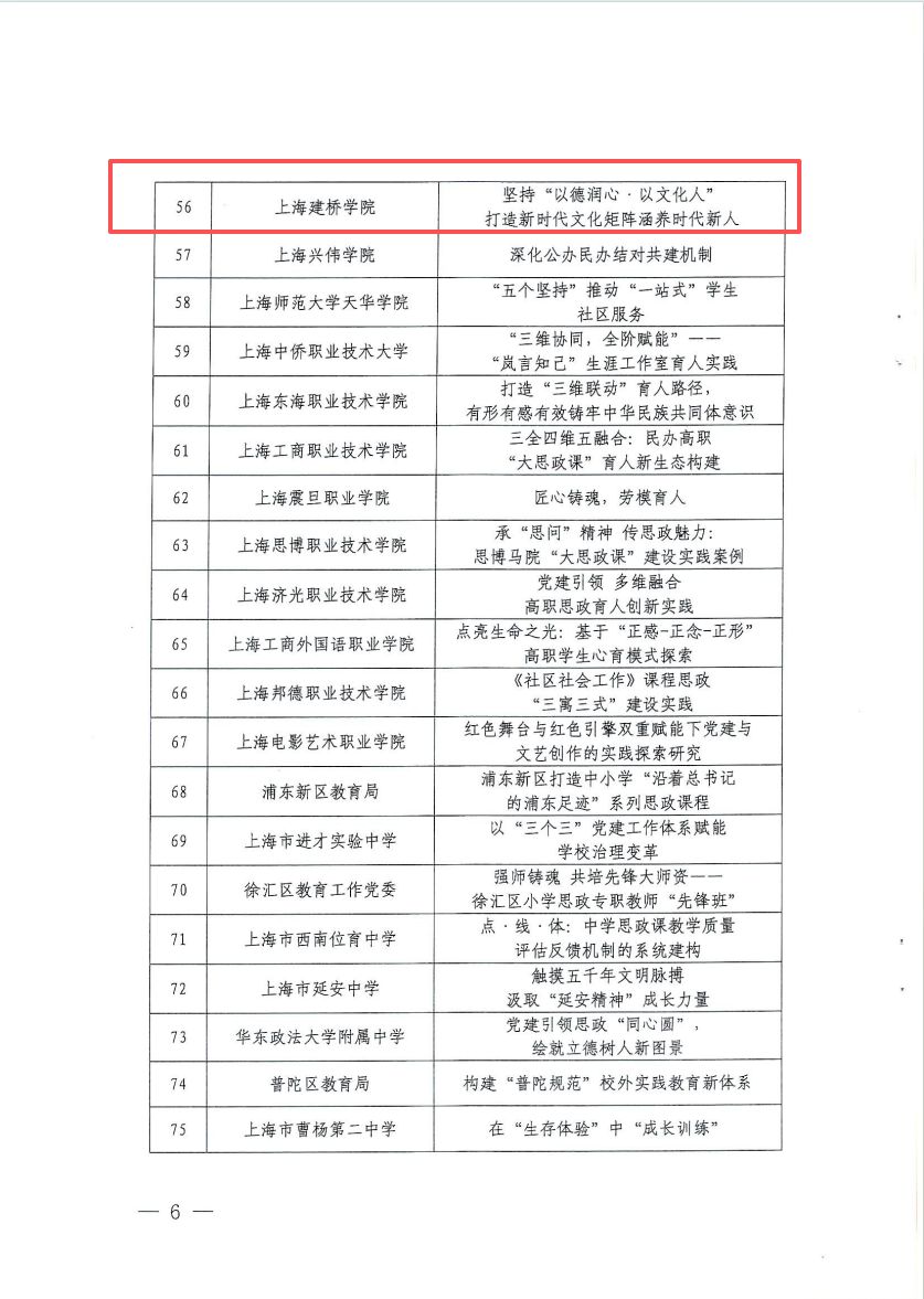 近日,上海市教卫工作党委、市教委公布2025年上海市立德树人机制综合改革试点典型工作案例入选名单。上海建桥学院商学院申报的《坚持以德润心·以文化人打造新时代文化矩阵涵养时代新人》案例成功入选,成为全市100个典型工作案例之一。
