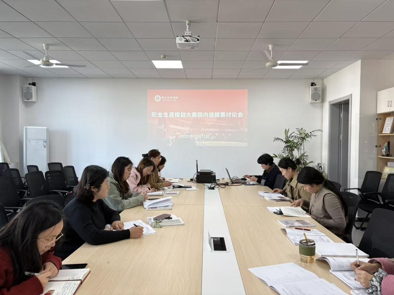 近日,职业技术学院以 “筑梦青春志在四方,规划启航职引未来” 为主题的职业规划大赛院内选拔赛顺利举办。在比赛之前,职业技术学院开展了专题培训指导座谈会,就学生岗位选择、职业规划、展示思路进行讨论。本次大赛旨在引导学生树立正确就业观,科学规划职业生涯,充分展现新时代大学生的职业潜力与奋斗姿态。职业技术学院党委副书记马冯莉及各年级辅导员担任评委,众多学生到场观摩支持。