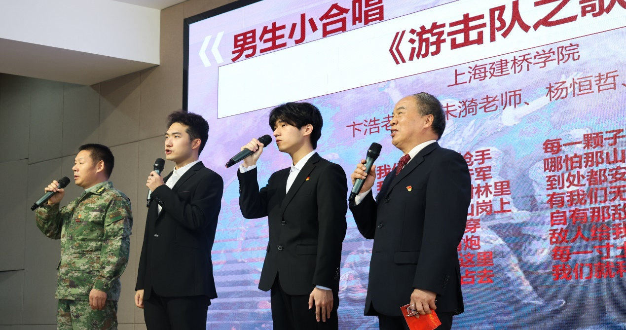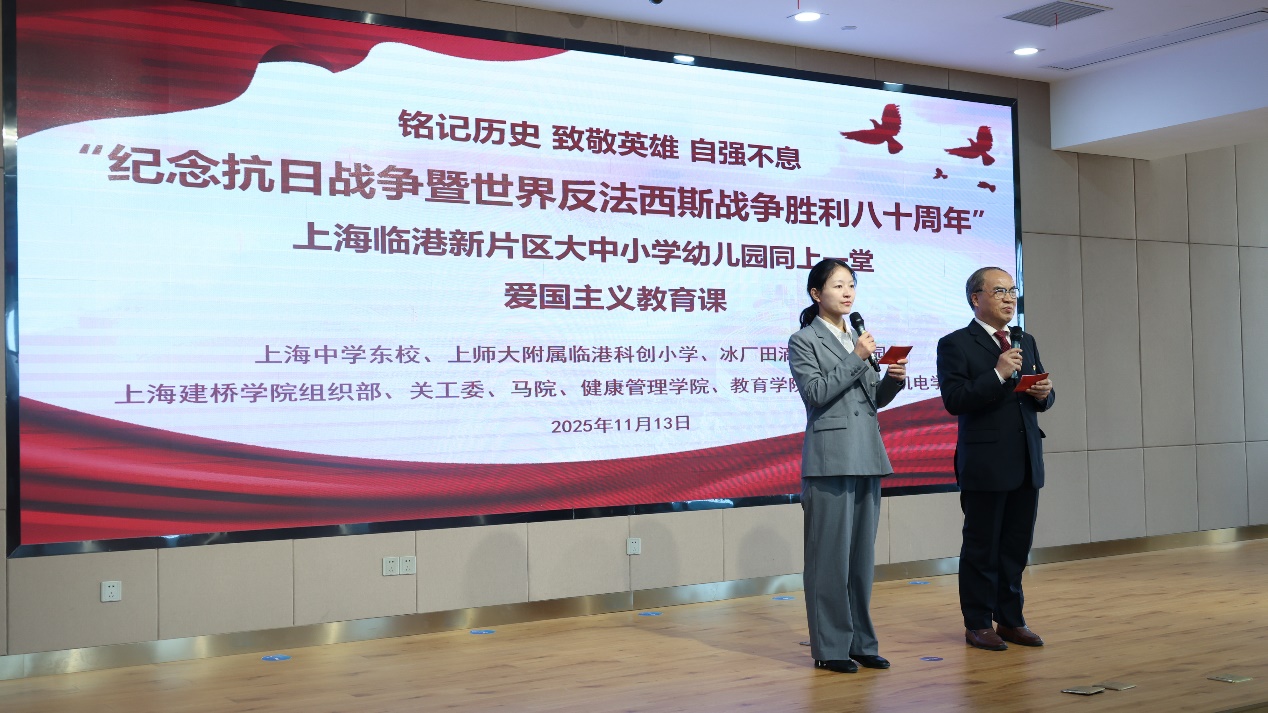 11月13日,上海建桥学院举办“纪念抗日战争暨世界反法西斯战争胜利八十周年”上海临港新片区大中小学幼儿园同上一堂爱国主义教育课。上海建桥学院、上海中学东校、上师大附属临港科创小学和冰厂田滴水湖幼儿园四所学校的师生代表参加了本次爱国主义教育课。本次活动也是我校党日主题活动展示会,二级学院基层党组织的党员代表观摩了本次党日主题活动。