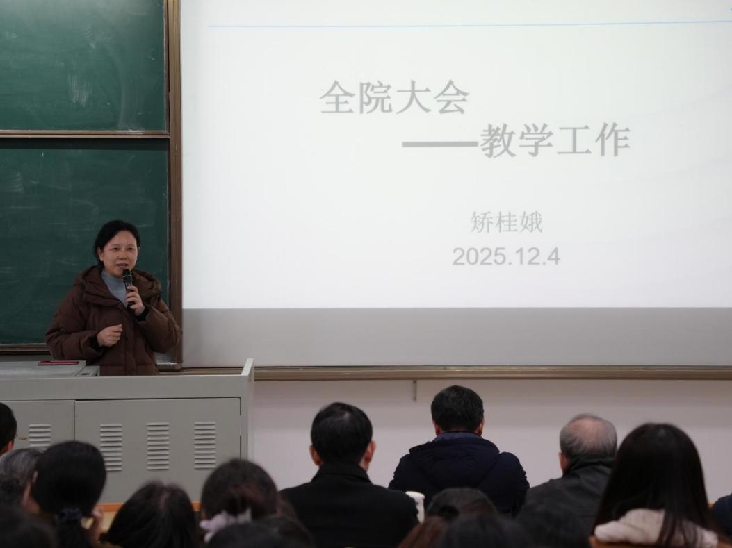 矫桂娥副院长从期末出卷与阅卷的要求和注意事项、评教评学工作、期末监考与成绩录入、本学期课程归档、2026届毕业生论文工作、自学加辅导、内涵项目建设、2025-2026-2教学任务等内容对教学工作进行部署。