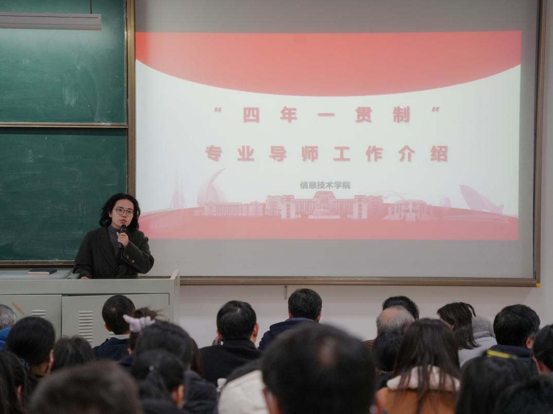 徐娜副书记从什么是“专业导师四年一贯制”、从“启明星”到“全覆盖”——信息走过的路、产教融合背景下信息专业导师“四位一体”新定位、专业导师“硬任务”、专业导师管理与考核等方面详细介绍学院的“四年一贯制”专业导师工作。