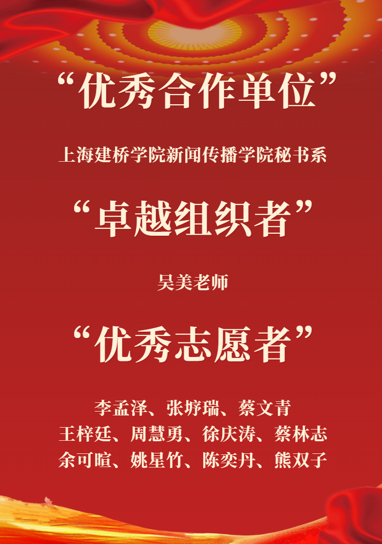 为深入学习宣传贯彻党的二十届四中全会精神,弘扬新时代雷锋精神,11月15日,中共二大会址纪念馆、中共中央军委机关旧址纪念馆、中共中央秘书处机关旧址纪念馆、中央特科机关旧址纪念馆,在上海市静安区青少年活动中心联合举办“志愿同心 公益领航”——2025年志愿者总结大会,我校新闻传播学院秘书系作为合作单位,在此次大会上荣获“优秀合作单位”称号,系主任吴美老师获得“卓越组织者”个人奖项,多名学生志愿者被评为“优秀志愿者”。