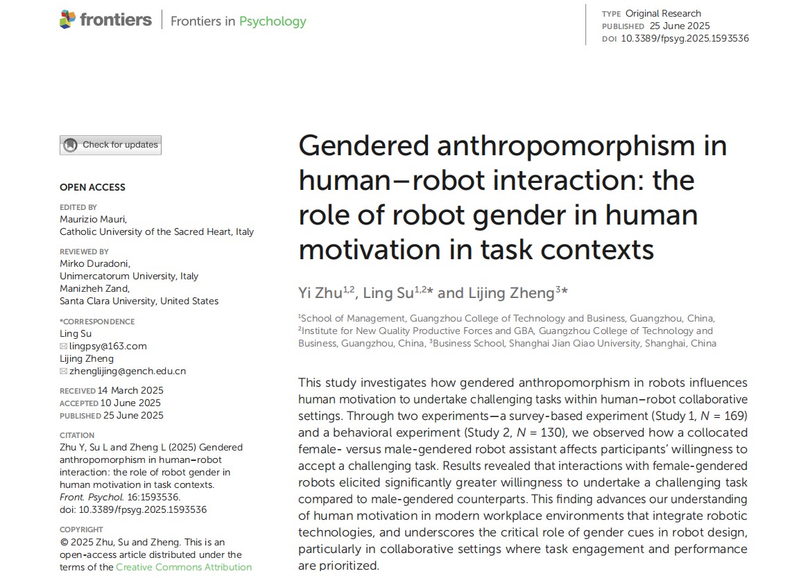 郑丽菁博士另有三项研究成果相继发表于国内外重要期刊:在《Psychology & Marketing》发表论文揭示了产品包装颜色的深浅会微妙影响消费者对功效与安全性的判断;在《Frontiers in Psychology》探讨了服务机器人的性别化设计如何影响人们与之协作的意愿;在《心理学报》分析了食物的视觉美感如何提升人们对健康价值的感知。这些研究均围绕消费者行为与人机交互展开,展现了应用心理学在营销与管理领域的巨大价值。