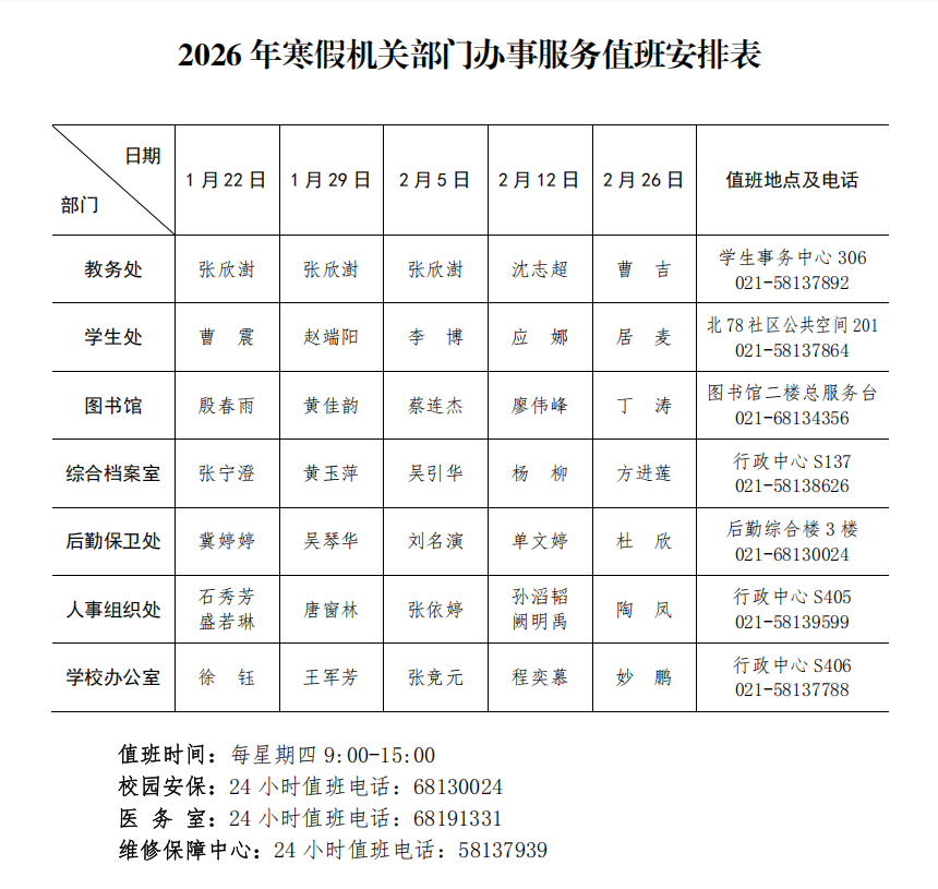 1. 寒假期间,各级干部要确保通信畅通,相关岗位应认真落实值班备勤,加强应急值守;各服务窗口要妥善安排好假期基本的办事服务,及时处理有关公务和师生事务。后勤、运维保障等服务部门的放假调休安排根据实际另行规定。